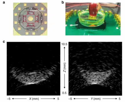 a) The schematic of IC for the dual-ring CMUT array. This IC includes receive IC, transmit IC, and the digital control circuitry. Schematic is not drawn to the scale. b) Experimental device of the CMUT for imaging ex vivo chicken heart phantom. c) Imaging results of the chicken heart phantom in XZ and YZ planes with 10 mm dimension size. Source: Nature.com