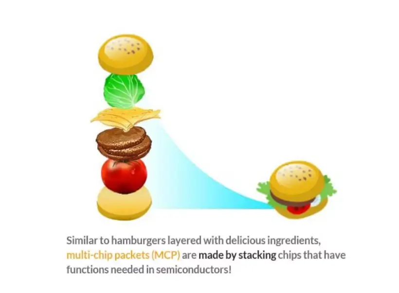 MCP, or Multi-Chip Package, refers to a technology that combines two or more semiconductor chips into a single package. While it appears as one semiconductor from the outside, it actually contains multiple chips inside. Unlike arranging individual semiconductors horizontally, MCPs stack chips vertically, significantly reducing the space they occupy, making them essential for compact devices like smartphones, tablets, and other portable electronics. Samsung uses the analogy of stacking a burger. Bun, cheese slice, patty, vegetables and other fillings make up a burger. Similarly, different chips are the ingredients that form an MCP. Each one can come from a different source.