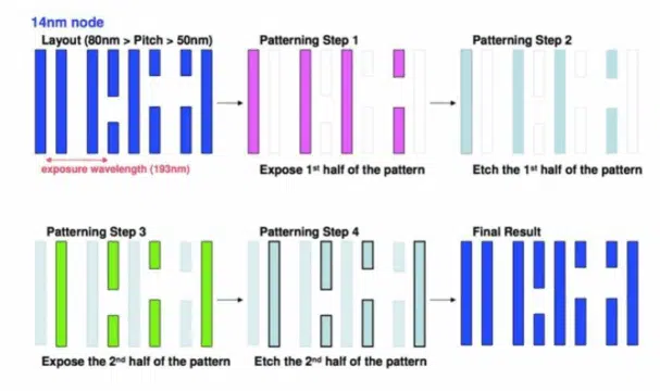 However, this approach faced challenges due to misalignment between masks, limiting minimum pitch reduction. To improve precision, self-aligned techniques such as self-aligned double patterning (SADP) and self-aligned quadruple patterning (SAQP) were later developed, which use spacer technology to define features with higher alignment accuracy.